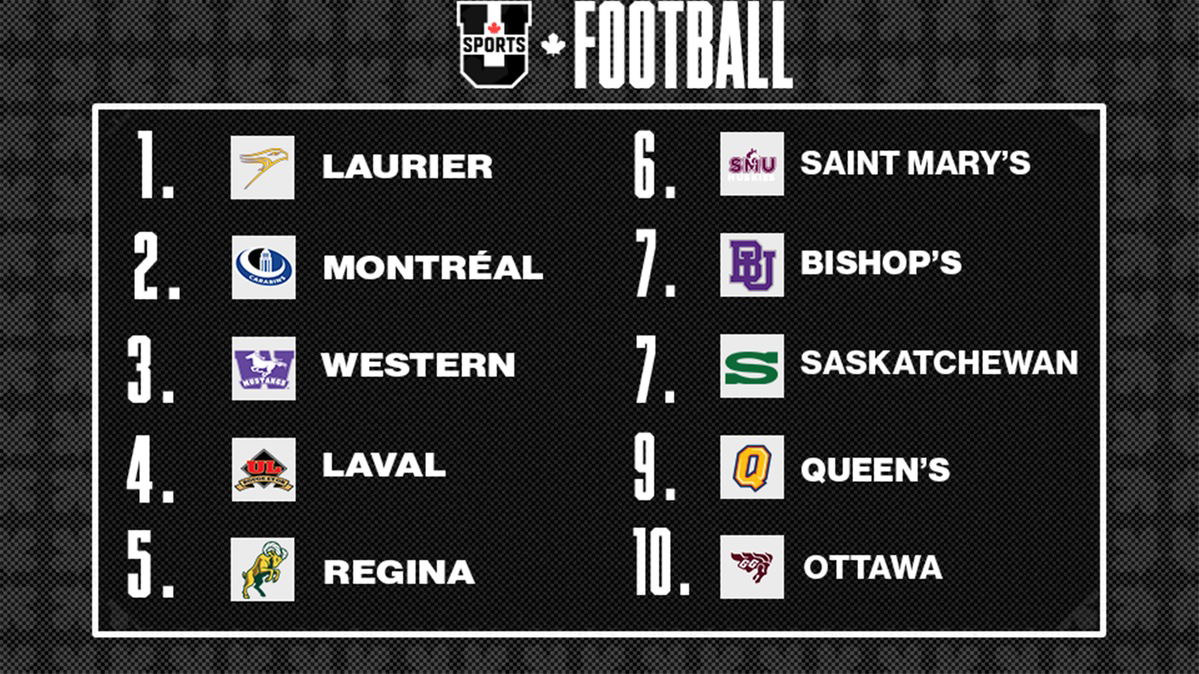 The Western Mustangs and Queen’s Gaels held firm at No. 3 and No. 9, respectively. Western hammered the Carleton Ravens 63-26 as Ethan Dolby rushed for 230 yards and four touchdowns, while the Gaels picked off Scott Barnett five times to stomp the Toronto Varsity Blues 44-6.