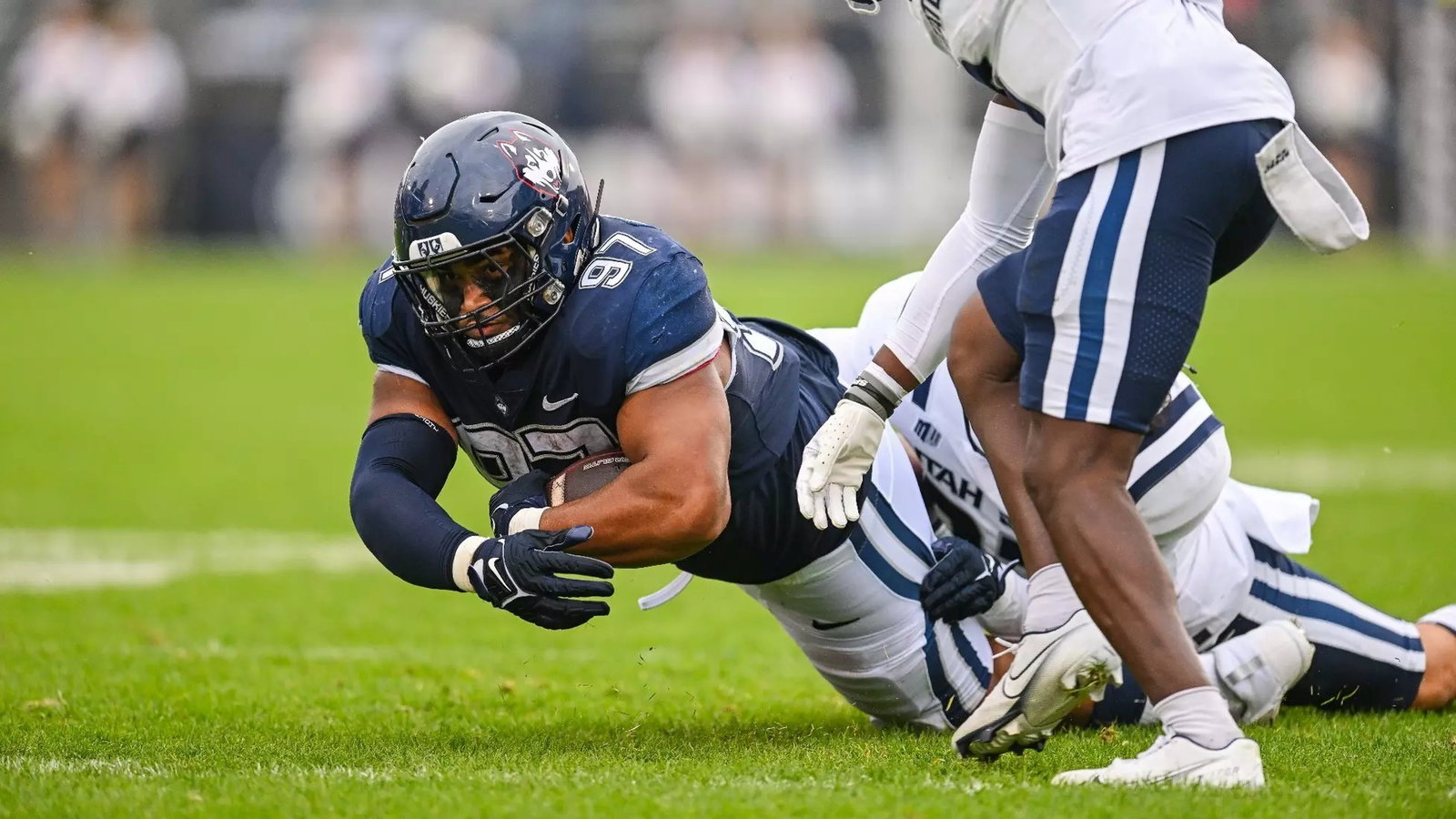 The six-foot-one, 300-pound defensive tackle took reps at running back for the University of Connecticut during the 2023 season, racking up 15 carries for 22 yards and six touchdowns. He also added a single reception for 10 yards. The big-bodied ball carrier got the gig because he was a force to be reckoned with as a high school running back, going for over 1,000 yards in both his senior and junior seasons at California Area High School in Coal Centre, Pa.